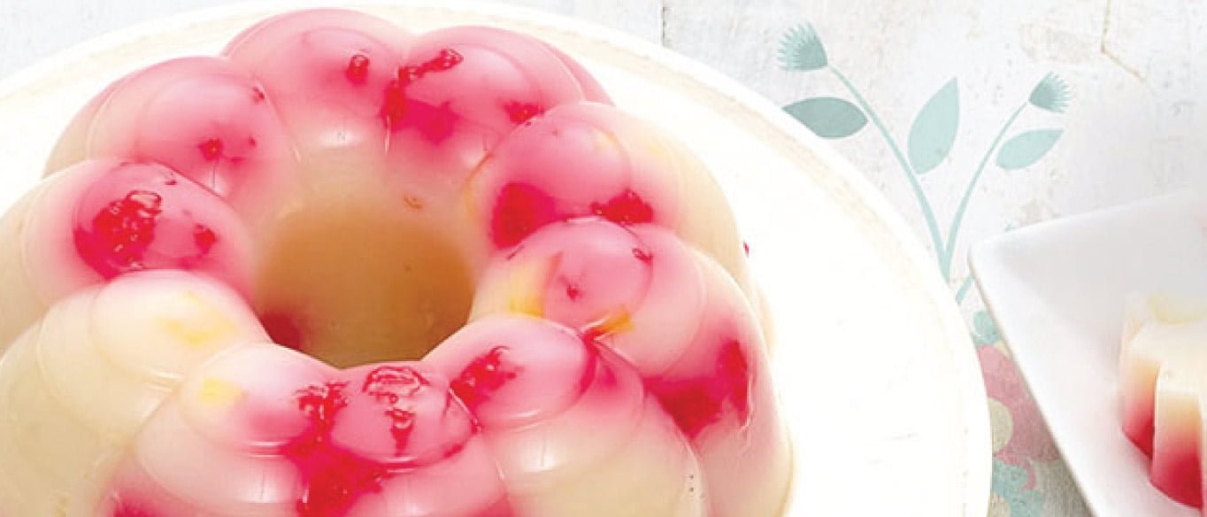 Add in the jackfruit mixture into a pan that’s about 1cm high and add a few Rubies into it. Let it sit for a moment, before adding another layer of jelly mixture with Rubies. Repeat this step until the mixture and Rubies finish. Serve cold.